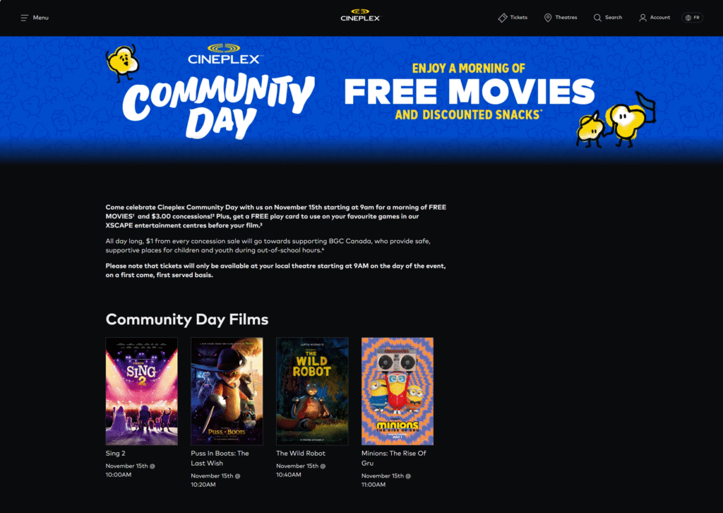 Cineplex表示,活动当天在影院及其娱乐中心每售出一份餐饮或游戏卡,将捐出 1加元 支持 BGC Canada(加拿大男孩女孩俱乐部)
